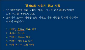 ÇÑÆí, ºÎ±âÃÑÀº 12ÀÏ ºÎõ ¼ÒÀç ±³È¸¿¡ 'Äڷγª19 È®»ê ¹æÁö¸¦ À§ÇÑ ±³È¸ ÇùÁ¶ ¿äû °ø¹®'À» ¹ß¼ÛÇϰí, Àü¿°º´ÀÌ °¨¿°µÇÁö ¾Êµµ·Ï ¼Ò¼öÀÇ ¿¹¹è¶óµµ öÀúÇÑ ´ëºñ¿Í ¼ºµµ°ü¸®¸¦ ÇØÁÙ °ÍÀ» ´çºÎÇß´Ù.